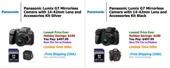 B&H Photo has a very good deal on the Panasonic Lumix G7 camera + 14-42mm lens + accessories kit: now under $500 (lowest price ever). Two different versions are available – black and silver: